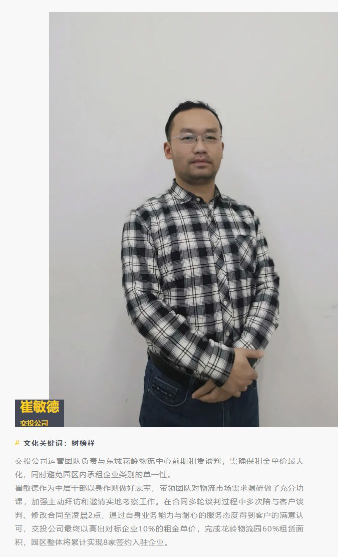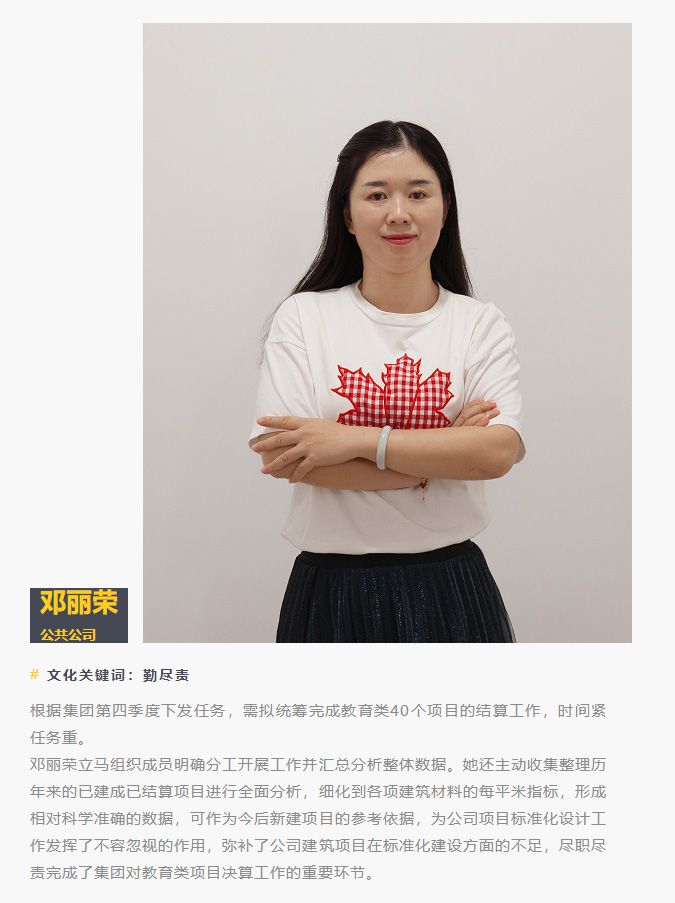 東城集團(tuán)“使命、責(zé)任、擔(dān)當(dāng)”核心價(jià)值觀深入人心,為了更好將企業(yè)文化植入行為,促進(jìn)東城集團(tuán)員工對企業(yè)文化的認(rèn)知理解和行為轉(zhuǎn)化,東城集團(tuán)在核心價(jià)值觀基礎(chǔ)上細(xì)化員工行為準(zhǔn)則,并每季度評選10名員工作為文化踐行標(biāo)桿。
